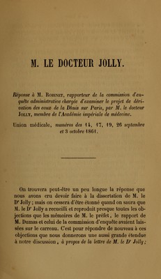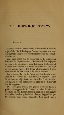 Eaux de Paris : lettre a un conseiller d'état pour servir de réponse aux adversaires des projets de la ville de Paris / par Robinet.