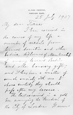 M0019599EA: Letter from Joseph Lister to Sir William Turner, 1907: first page