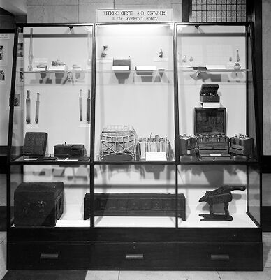 Credit: M0012257: Wellcome Historical Medical Museum exhibition: "The History of Pharmacy": display case. Source: Wellcome Collection.
