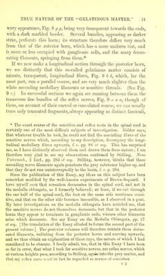 ![wavy appearance, Fig. 8 g g, being very transparent towards the ends, with a dark marbled border. Several bundles, appearing as darker striae,, perforate this horn; its structure therefore differs very much from that of the anterior horn, which has a more uniform tint, and is more or less occupied with ganglionic cells, and the many decus- sating filaments, springing from them.* If we now make a longitudinal section through the posterior horn, we see distinctly that this so-called gelatinous matter consists of minute, transparent, longitudinal fibres, Fig. 9 b b, which, for the most part, run a parallel course, and are very much slighter than the white ascending medullary filaments or sensitive threads. (See Fig. 9 c.) In successful sections we again see running between them the transverse fine bundles of the reflex nerves, Fig. 9 a a a, though of these, on account of their curved or convoluted course, we can usually trace only truncated fragments, always appearing as distinct fasciculi, * The exact course of the sensitive and reflex roots in the spinal cord is certainly one of the most difficult subjects of investigation. Bidder says, that whatever trouble he took, he could not find the ascending fibres of the sensitive nerves which, according to my description, accompany the longi- tudinal medullary fibres upwards, I, c. pp. 84 et seq. This has surprised me, as I have distinctly observed them and drawn them from nature; I am therefore very glad to see my observations confirmed by Stilling. Neue Untersuch., 2 Lief., pp. 285 et seq. Stilling, however, thinks that these ascending nerve filaments again penetrate the grey substance higher up, and that they do not run uninterruptedly to the brain, /. c. p. 284. Since the publication of this Essay, my ideas on this subject have been somewhat modified by the well-known experiments of Brown-Sequard. I have myself seen that sensation decussates in the spinal cord, and not in the medulla oblongata, as I formerly believed; at least, if we cut through the one half of the spinal cord, the foot on the same side continues sensi- tive, and that on the other side becomes insensible, as I observed in a goat. My later investigations on the medulla oblongata have satisfied me, that the sensitive nerves do not themselves decussate, but that in the posterior horns they appear to terminate in ganglionic cells, whence other filaments arise which decussate. See my Essay on the Medulla Oblongata, pp. 27 et seq. [The translation of the Essay alluded to forms the second part of the present volume.] The posterior columns will therefore contain these decus- sated filaments, radiating from the posterior horns and curving upwards, and we thus obtain an explanation of these rays, the nature of which I had considered to be obscure. I freely admit, too, that in this Essay I have been so far in error, that what I took for sensitive nerves, are reflex nerves, which at various heights pass, according to Stilling, again into the grey matter, and that my reflex roots must in fact be regarded as nerves of sensation. E 2](https://iiif.wellcomecollection.org/image/b21273194_0085.jp2/full/800%2C/0/default.jpg)