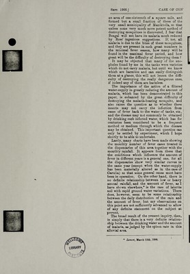Credit: Abstract of a paper on the relationship of drinking water, water-logging and the distribution of Anopheles mosquitoes, respectively to the prevalence of malaria north of Calcutta / by Leonard Rogers. Source: Wellcome Collection.