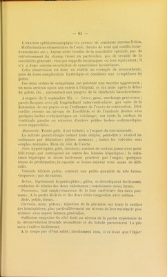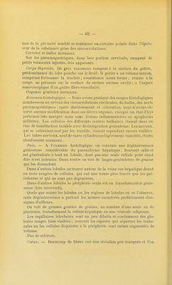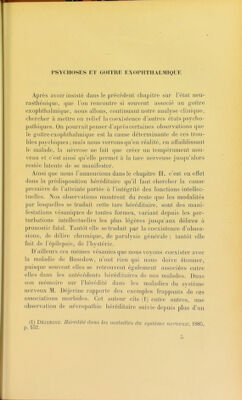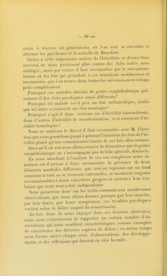 ![siècle ù travers six générations, où l'on voit se succéder et alterner les psyclioses et la maladie de Basedow. Grâce à cette importante notion de l'iiérédités ce divers états nerveux ne nous paraissent plus comme des faits isolés, sans analogie ; mais par contre il faut reconnaître que le mécanisme intime et les lois qui président à ces mutations nombreuses et incessantes, que l'on trouve dans toutes les névroses,nous échap- pent complètement. Pourquoi ces malades atteints de goitre exophthalmique pré- sentent-il des états psycliiques aussi différents? Pourquoi tel malade a-t-il ])ris un état mélancolique, tandis que tel autre a contracté un état maniaque? Pourquoi s'agit-il dans certains cas d'iiérédité intermittente, dans d'autres d'hérédité de transformation, et si rarement d'iié- rédité homologue ? . Nous ne saurions le direct il faut reconnaître avec M. Cliris- tian que nous possédons jusqu'à présent l'intuition des lois del lié- rédité plutôt qu'une connaissance exacte de ces lois elles-mêmes. Quoi qu'il en soit nous allons essayer de démontrer que le goître exophthalmique ne s'accompagne pas de folie spéciale, distincte. En nous attachant à l'analyse de ces cas complexes notre m- tention est d'arriver à faire reconnaître la présence de deux éléments morbides diff'érents, qui, tout en reposant sur un fond commun et tout en se trouvant entremêlés, se montrent toujours reconnaissal)lesàleurs caractères propres et surtout à leur évo- lution qui reste tout-à-fait indépendante. Nous passerons donc sur les traits communs aux nombreuses observations, que nous allons donner, puisque par leur marche, par leur durée, par leurs symptômes, ces troubles psyclnques varient selon le délire auquel ils ressortissent, Au lieu donc de nous engager dans ces données abstraites, nous nous contenterons de rapporter un certain nombre d ob- servations qui nous semblent caractéristiques comme exemples de coexistence des diverses espèces de délire : en même temps nous ferons suivre cliaque série d'observations, des développe- ments et des réflexions qui doivent en être la suite.](https://iiif.wellcomecollection.org/image/b21712463_0066.jp2/full/800%2C/0/default.jpg)