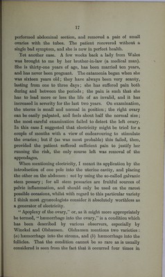 ![ON CHRONIC DISEASE OF THE UTERINE APPP]NDAGES. With a Table containing Short Notes of Thirty Consecutive Cases treated' by Abdominal Section. j if , WILLIAM DUNCAN, M.D., F.E.C.S.Eng., Obstetric Physician to, and Lecturer on Obstetrics and Gynaecology at, the Middlesex Hospital; Senior Physician to the lioyal Hospital Jor Women and Children ; Examiner in Obstetrics at the Examining Board for 'England and at the Society of Apothecaries. Read at a Meeting of tke Medical Society of London. , ^ lionbott: - ’ JOHN BALE & SONS, 87-89, GREAT TITCHFIELD STREET, OXFORD STREET, W. 1891.](https://iiif.wellcomecollection.org/image/b22377578_0003.jp2/full/800%2C/0/default.jpg)