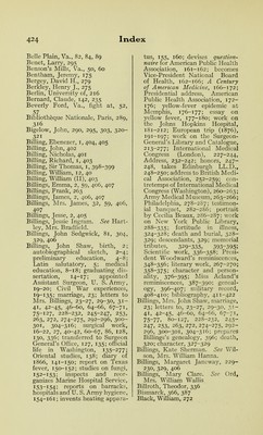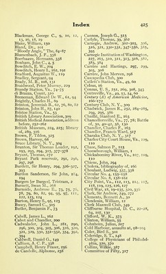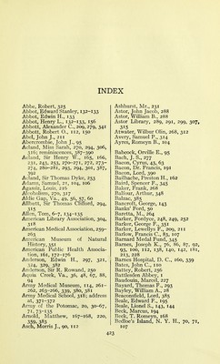 ![Blackman, George C, 9, 10, 12, 13, 16, 18, 19 Blake, William, 150 Bland, Dr., loi Bloody Angle, The, 84-87 Blumenbach, J. F., 338 Boerhaave, Hermann, 338 Bonham, John C, 4, 5 Bowditch, E. W., 204 Bowditch, Henry I., 162, 191 Bradford, Augustus W., 119 Bradley, Sergeant, 94 Brady, M. B., 108, 131 Braidwood, Peter Murray, 229 Brandy Station, Va., 74-75 di Brazza, Count, 310 Breneman, Edward De W., 61, 94 Brightly, Charles H., 89 Brinton, Jeremiah B., 62, 76, 80, 82 Brinton, John H., 87, 140 Bristoe Station, Va., 53 British Library Association, 309 British Medical Association, address before, 252-262 British Museum, 224, 225; library of, 289, 316 Brown, F. Tilden, 325 Brown, Harvey, 68 Bruce Library, N. Y., 304 Brunton, Sir Thomas Lauder, 192, 193, 293, 294, 315, 377-378 Bryant, Thomas, 272 Bryant Park reservoir, 291, 296, 297, 298 Burdett, Sir Henry, 294, 326-327, 393 Burdon Sanderson, Sir John, 1S4, 194 Burgers [or Burges], Tristram, 2 Burnett, Swan M., 268 Burnside, Ambrose E., 73, 75, 76, 78, 79, 80, 82, 94, 95, 97, III, 122, 123, 124 Burton, Henry S., 95, 123 Busey, Samuel C, 305 Butler, Benjamin F., 73 Cabell, James L., 162 Cabot and Chandler, 200 Cadwalader, John L., 281, 290, 296, 300, 304, 305, 306, 316, 320, 321, 329, 330, 331-332, 354, 392, 394 Caldwell, Daniel G., 149 Callisen, A. C. P., 338 Campbell, Henry Fraser, 256 de Candolle, Alphonse, 258 Cannon, Joseph G., 313 Carlyle, Thomas, 39, 362 Carnegie, Andrew, 302-303, 306, 316, 321, 330-331, 347-356, 385, 393 Carnegie Institution of Washington, 227, 263, 310, 311, 313, 316, 382, 383, 384 Carrere and Hastings, 297, 299, 303, 308 Carrere, John Merven, 298 Cascapedia Club, 300 Catlett's Station, Va., 49, 60 Celsus, 16 Census, U. S., 251, 269, 308, 343 Centreville, Va., 49, 53, 54, 60 Century {A) of American Medicine, 166-172 Century Club, N. Y., 309 Chadwick, James R., 252, 284-285, 294, 295, 386 Chaill6, Stanford E., 163 Chancellorsville, Va., 77, 78; Battle of, 30, 40-42, 58, 130 Chandler, Charles F., 163 Chandler, Francis Ward, 317 Charaka Club, N. Y., 317 Charles City Court House, Va., 109, 110 Chase, Salmon P., 115 Cheeseborough, William, i Chickahominy River, Va., 107, 109, no Chiene, John, 294 Cholera, bibliography of, 166 Choulant, Ludwig, 337, 338 Circular No. 4, 155-158 Circular No. 8, 158-161 City Point, Va., 112, 113, 114, 117, 118, 119, 125, 126, 127 Civil War, 18, 19-135, 320, 336 Clark, Sir Andrew, 249, 272 Clements, Bennett A., 30 Clendenin, William, 12 Clerk Maxwell Club, 349 Cliffburne Hospital, D. C, 22-28, 64, 107, 130 Clifford, W. K., 373 Clinton, William, 55 Cohnheim, Julius, 207 Cold Harbour, assaults at, 98-104 Coler, Bird S., 301 Coleridge, S. T., 148 College of Physicians of Philadel- phia, 320, 370 Collins, Wilkie, 387 Committee of Fifty, 317](https://iiif.wellcomecollection.org/image/b2135201x_0459.jp2/full/800%2C/0/default.jpg)