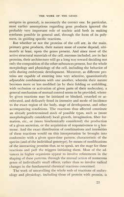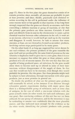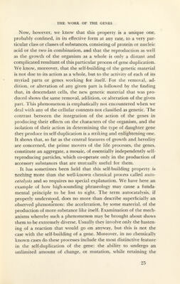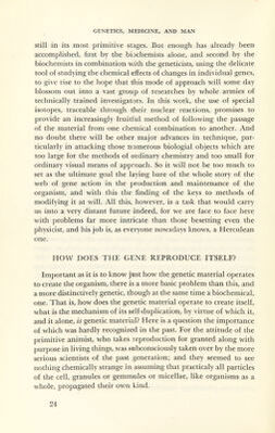 ![GENETICS, MEDICINE, AND MAN ability to reproduce itself, even in its changed form, on the same medium as before. From this it is evident that in some way the gene is able to impress its own pattern upon substances in the medium, and that even when that pattern is changed, it still retains this power. It is this that most strikingly distinguishes a gene from other so-called autocatalytic substances, and renders it the only fit material to form the basis of life. For it is the duplication of mutations which constitutes the core of the process of evolution, and life can be understood only in terms of the evolution that has made it what it is. The few hypotheses advanced in partial explanation of the peculiar self-duplicating power of the gene that allows it to copy even its own variations belong as yet rather in the realm of specu¬ lation. It would take us too far afield to review these here. The view preferred by the author is that the scattered materials of the medium are arranged by the gene into a pattern like its own by means of the very same forces that have been found to bring like genes together during the process called synapsis (a process which we shall further consider below). For if we assume that each given part of a gene that forms an element of its mutable pattern is able to attract to itself a like part that had been floating in uncombined fashion in the surrounding medium, just as the gene as a whole attracts to itself another whole gene that is like it, then the various disorganized parts present in the medium would become gathered together next to the mother gene in an arrangement like its own, and so a replica of the old gene would be created. It has long been denied by physicists that such specific forces of attraction can oper¬ ate over distances large enough to be microscopically visible, as appears to be true of the synaptic forces. This difficulty of the specificity of the forces can be overcome, however (as was pointed out independently by Jordan [1938], the present writer [1941], and Fabergé [1942]), if we suppose them to involve some sort of periodic movement or vibration, those of like kind causing at¬ traction; there is some recent experimental evidence by Bernal and Fankuchen (personal communication) in favor of this view, derived from their studies on viruses. It is as yet too early to conclude with certainty that gene re- 26](https://iiif.wellcomecollection.org/image/b18029152_0043.JP2/full/800%2C/0/default.jpg)