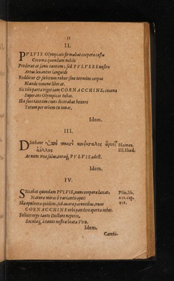 ![Il. VLVIS Olympiacofirimabat corpora ceftu Ceroma quondam nobile Proderat at [anis tantum fed P V LV E R Emoftro Artus leuanttir languidi Redditur c» fubitum robur: fine tormine covpus Blande veneno liberat. Sictibipartavigetiam C O RN ACCHIN E,cosona Superans Olympicas tubas. Ila (uos tantutn ciues decorabat bonore Totum per orbem tu wuuas, Idein. IIl. Ty ^ízgo qmoyi XoVioyaAoc apui] Homer, dés 1I, lliad. At nunc vua (aluseuraa, P V LV 18 adest. Idem. I V. Canmbi-](https://iiif.wellcomecollection.org/image/b32989787_0019.jp2/full/800%2C/0/default.jpg)