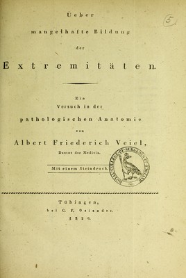 Ueber mangelhafte Bildung der Extremitäten : ein Versuch in der pathologischen Anatomie / von Albert Friederich Veiel.