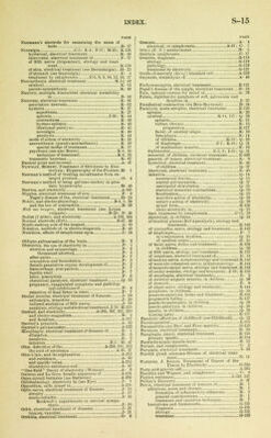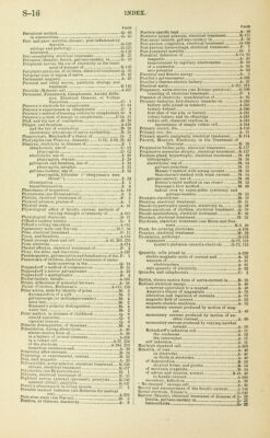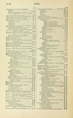 ![PAGE Percutient method ...O- 65 in amenorrhea G- 65 Peri- and para- metritis,chronic; post-inflammatory deposits G-125 etiology and pathology G-125 treatment *T1^ Peri-encephalitis, electrical treatment K- 25 Perineum (female), fistula, galvano-cautery in L- 22 Peripheral nerves, the use of electricity in the treat- ment of diseases of. K-1.13 Peripheric paralysis, of children, electrical treatinent.Q- 38 Peripolar zone or region of nerve B- 42 Permanent magnets A- 20 Peroneal and tibial nerves, paralysis, etiology and treatment K-146 Peroxide (Roberts) cell A-267 Peterson', FitEDEiurK, Cataphoresis. Anodal Diffu- sion. Electrical Osmosis, or Voltaio Narcotism C- 1 Peterson's electrode for cataphoresis C- 14 Peterson's experiments in cataphoresis C- 5 Peterson's method of treating orchitis by cataphoresis..O- 9 Peterson's system of dosage in cataphoresis C-14, 15 Pfaff. and the law of contraction B- 39 Pfliiger, and faradism A-120 and the law of contraction B- 39 electrotonie alterations of nerve excitability B- 35 Phagocytosis. Metchnikoff's theory of. G- 2 Pharyngitis (see Pharynx, diseases) C-12; 1-19,29, 33 Pharynx, electricity in diseases of. I- 1 cataphoresis, use of. C- 12 pharyngitis C- 12 electrolysis, use of. I- 29 pharyngitis, chronic I- 29 galvanism and faradism, use of. I- 33 pharyngitis, atrophic I- 33 galvano-cautery, use of. I- 18 pharyngitis, follicular (clergyman's sore throat) I- 19 illumination I- 1 trausillunii nation I- 6 Phenomena of magnetism., A- 19 Photophores (see Illumination) I- 3 Phthisis, electrical treatment of. F- 2 Physical advance, process of A- 1 Physical state A- 31 Physiological effect of faradic current, methods of varying strength or intensity of. A-165 Physiological rheoscope B- 17 Piffard's cautery battery L- 8 Piffard'3 ml I inn rheophore A-181 Pigmentary mole (see Nievus) 11-7, 3D Piles, electrical treatment N- 15 Pixon. and faradism A-118 Plante storage sheet and cell A-43, 269. 270 Plate electrode A-174 Pleural effusion, electrical treatment of. F- 2 Pliny, the elder, and electricity A-187 Pueumogastric, galvanization and faradization of the..F- 1 Pneumonia of children, electrical treatment of atelec- tasis occurring in the Q- 14 Poggendorff'3 method of compensation B- 15 PoOllendorff's mirror galvanometer A- 23 Poggendorff's mnltiplicator B- 4 Pocket-battery, faradic A-168 Points, differences of potential between ..A- 16 Points d'election, Duchenne's A-11S, 119 Polar action, tests for identity of poles M- 2 decomposition of a salt M- 3 galvanoscope (or milliamperemeter) M- 4 meat test M- 2 Stammer's polarity distinguisher M- 4 water test M- 2 Polar method, in diseases of childhood Q- 8 cirsoid aneurism Q. 8 vascular tumors q. 9 Polarity distinguisher, of Stammer M- 4 Polarization, during electrolysis A- 39 electro-motive force of...] A- 39 in a battery of several elements A-256 in a voltaic cell A-27, 254 of the electrode A-244- 253 transition resistance and .' .'*. a- 39 Polarizing after-currents ,B- 34 Polarizing, or experimental, current ,...b- 32 Pole, uuit magnetic A- 20 Poliomyelitis, acute anterior, electrical treatment K-126 chronic, electrical treatment K-117 Polytrichia (see Hypertrichosis) .,' H- 1 Polyuria, electrical treatment of. .„. E- 25 Popliteal nerves, external (peroneal), paralysis...'...'.IK-! 46 internal (tibial), paralysis K-147 Ferret's phenomenon in living muscle C- 2 Portable medical batteries (see Batteries for medical use) A-^6 Port-wine stain (see Nsevus) '„'„ H- 5 Positive, or vitreous, electricity A- 8 PAGE Positive specific heat A- 48 Posterior spinal sclerosis, electrical treatment ...K-ll 1 Post-nasal catarrh, galvano-cautery in I- 16 Post-partum congestion, electrical treatment G-138 Post-partum haemorrhage, electrical treatment P- 7 Post-puerperal metritis G- H Potential, definition of. A-14. 93 magnetic A- 20 measurement by capillary electrometer B- 10 of a conductor A- 93 zero potential A- 93 Potential and kinetic enurgy A- 5 Pouillet's galvanometer A-226 Pouillet's thermo-electric battery A- 47 Practical units A-211. 212 Pregnancy, extra-uterine (see Ectopic gestation) G-I99 vomiting of, electrical treatment P- 4 Presence of electricity, manifestation of. A- 85 Primary batteries, introductory remarks on A-240 battery cells joined in intensity A-245 battery defined A-240 first idea of the pile, or battery A-241 voltaic battery and its offsprings A-245 voltaic cell, chemical reaction in A-243 inconstancy of simple voltaic cell A-244 Primary circuit, the A-158 Primary coil, the A- 51 Primary spastic paraplegia, electrical treatment K-114 Puince, Mokton, Electricity in the Treatment of Neuroses K- 26 Progressive bulbar palsy, electrical treatment K-117 Progressive muscular atrophy, electrical treatment...K-117 Prostate gland, hypertrophy, electrical treatment M- 48 bibliography M- 56 electrolysis, use of. M- 54 galvano-puncture M- 55 Massey's method with strong current M- 55 Steavenson's method with weak current M- 54 galvano-cautery, use of. M- 49 Bottini's rapid method in one seance,,. M- 52 Newman's slow inothod M- 49 radical cure by supra-pubic cystotomy and galvano-cautery , M- 53 Prostatic electrolyzer M- 55 Pruritus, electrical treatment H- 31 Pseudohypertrophic paralysis, electricity in Q- 39 Pseudo-paralysis, of children, electrical treatment...Q- 39 Pseudo-neurasthenia, electrical treatment , K- 49 Psoriasis, electrical treatment H- 32 Psychoses, electrical treatment (see Brain and Neu- roses K-6, 30 Punk, for covering electrodes A-176 Purpura, electrical treatment H- 32 Pyosalpinx, pathology G-115 treatment G-73, 115 Goelet's platinum cannula-eleetrode G-73, 113 Quantity, cells joined in A-250 electro-magnetic units of current and A- 25 measure of. A- 91 electrometers.... A- 91 unit quantity of electricity A- 92 Quincke, and cataphoresis C- 2 Rabbit, electro-motive force of nerve-current in B- 28 Radiant electrical energy A- 49 a current equivalent to a magnet A- 49 Ampere's theory of mag
