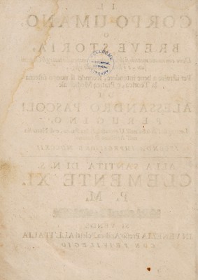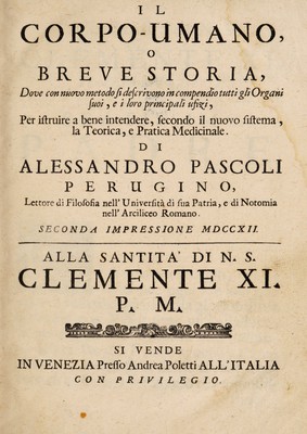 Il corpo-umano, o breve storia, dove con nuovo metodo si descrivono in compendio tutti gli organi suoi, e i loro principali ufizi, per istruire a bene intendere, secondo il nuovo sistema, la teorica e pratica medicinale / di Alessandro Pascoli.