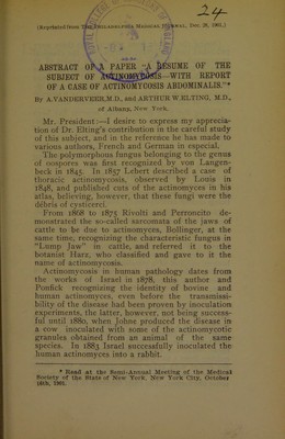 Abstract of a paper 'A resume of the subject of actinomycosis, with report of a case of actinomycosis abdominalis' / by A. Vanderveer and Arthur W. Elting.