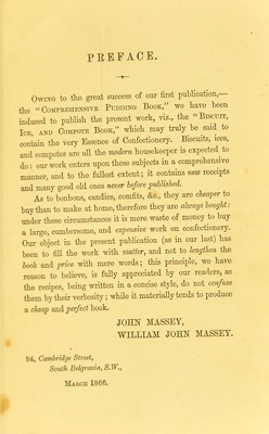Massey and son's biscuit, ice, & compote book, or, The essence of modern confectionery : containing many receipts never before published, including their Anglo-Russe, new system of serving dinners.