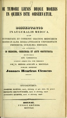 De tumore lienis deque morbis in quibus iste observatur : dissertatio inauguralis medica ... / publice defendet Joannes Henricus Clemens ; opponentibus Josepho Koenig, Ernesto Brunswicker, Augusto Kemper.