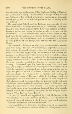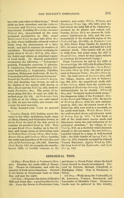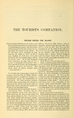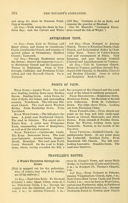 ![and along the shore to Dunnose Point. Stop at Shanklin. Uth Drt?/.—Walk along the shore to San- down Baj-; visit the Culvers and White Cliff Bay. Continue as far as Eyde, and examine the quarries at Binstead. [See Dr. Mantell's Geological Excur- sions round the Isle of Wight.'] ANTIQUARIAN TOUR. Jsf Day.—From Eyde to Ninham and Quarr Abbey, and thence to Carisbrooke Castle, Carisbrooke Church, and remains of ancient palace at Swainstone; Shalfleet Church; Yarmouth. 2nd Day.—Through Freshwater across the Downs; observe the numerous tumult; to Mottistone Church and the Longstone. Thence to Brighstone. Cross to Row- borough, Gallibury, and Newbarns (Celtic relics), and visit Shorwell Church. On to Newport. 3rd Day.—From Newport to Arreton Church. Thence to Kingston Church, Chale Church, and Ecclesiastical Relics in Chale Abbey Farm. Traces of Celtico-Roman road and encampment at Niton. Visit Kingston, and pass through Godshill (Chui'ch) and Appuldurcombe to Ventnor. Mh Day.—Visit St. Lawrence Church. Return to Ventnor, and then, through Bon- church (Old Church), to Shanklin (Church) and Brading (Church). Cross to Ashey and Knighton. Back to Ryde. POINTS OF VIEW. Near Ryde.—Appley Wood. The road near Brading, looking down upon Brading Haven, Brading Down. Ashey Down, for view of Ryde, the Solent, and surrounding country. Newchurch. The hill near Bin- stead Church. The road above Wootton Bridge. From Bembridge Down. From Yaverland. Near West Cowes.—The hill above the town. A point near Northwood Church. The road to Osborne. The ascent above King's Key. A point near Whippence Farm, commanding views of Hampshire, as well as of the island-scenery. Near Newport.—Carisbrooke Castle. The Keep. Bowcombe Down. The road near Gatcombe. Arreton Down. Stapler's Heath. Mountjoy. The road near North Court. Shorwell. On the road to Brigh- stone, where, having ascended the hill, a fine prospect of the Channel and the south coast of the island is suddenly presented. Near Brighstone.—Brighstone Down. Mottistone Down. On the brink of the hill over Calbourne. From St. Catherine's Down. The ridge above Niton. Looking out from Blackgang Chine. Near Freshwater.—From almost any point on the long and lofty chalk-range known as Chessel, Shalcombe, and Afton Downs. From summit of Needles Down. From the Warren, looking down upon Yarmouth. Norton, at the mouth of the Yar river. Near Ventnor.—Godshill Church. Ap- puldurcombe Down. At any point along the Undercliff. Boniface Down. From Bonchurch Old Church. The hill over- looking Luccombe. Shanklin Down. The road near Sandown. TRAVELLER'S ROUTES. A Week's Excursion tlorougli the Island. [This is mapped out for the pedestrian, who, of course, may vary it by making use of the railways.] 1st Dr/7/.—Start from Ryde: To Binstead (Church) 1 mile; Quarr Abbey, ruins of, 2 m.; Fish-house Creek, 1 m.; through the coppice into the highroad, and by Woot- ton, 1 m.; to Arreton (Chitrch), 3 m.; cross St. George's Down, and across Shidc Bridge, to Carisbrooke (Castle and Church), 4 m.; to Newport (St. Thomas's Church), Im. 2nd Day.—From Newport to Osborne, passing AVhippingham Church, right, 4 m.; East Cowes (East Cowes Castle and Norris Castle), 1 m.; cross by ferry to West Cowes, and passing Northwood, right, to Parkhurst (Barracks and Reformatory), 3 m.; through Parkhurst Forest to Newton (new Churcli](https://iiif.wellcomecollection.org/image/b21038090_0366.jp2/full/800%2C/0/default.jpg)