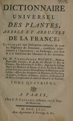 Dictionnaire universel des plantes, arbres et arbustes de la France. Contenant une description raisonnée de tous les végétaux du royaume, considérés relativement à l'agriculture, au jardinage, aux arts & à la médecine des hommes & des animaux ... / [Pierre-Joseph Buc'hoz].
