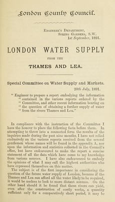 London water supply enquiry : engineer's report on the London water supply from the Thames and Lea, dated 1st September, 1891.