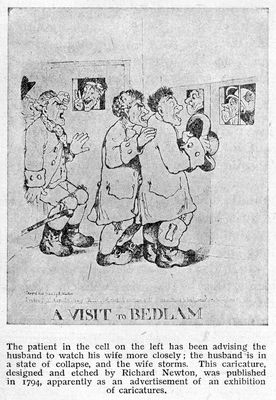 Credit: M0017537: Two illustrations of visitors at Bedlam. Source: Wellcome Collection.