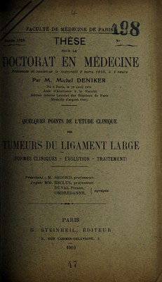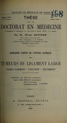 Credit: Quelques pointes de l'étude clinique des tumeurs du ligament large (formes cliniques--évolution--traitement) ... / par Michel Deniker. Source: Wellcome Collection.