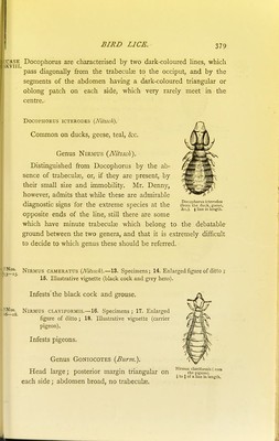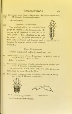 ![CASE Trichodectes scalaris {Mizsc/i).—10. Specimens; 11. Enlarged figure of ditto; 12. Illustrative vignette (cow). IO—12. Common upon cattle, and also found on the ass. Trichodectes scalaris (on the ox). £ line in length. Trichodectes equi (on the horse), i line in length. Nos Trichodectes equi {Linn.)—13. Specimens (eggs and insects); 14. Enlarged J3-I5- figure of ditto; 15. Illustrative vignette (horse). Common on the horse and ass, especially when fresh from pasture—in other words, when the parasites have had time to pro- pagate undisturbed by the currying comb. Nos. Trichodectes latus (Nitzsch).—16. Specimens (4); 17. Enlarged figure of 16—i's ditto; 18. Illustrative vignette (spaniel). Infests the dog, and is commonest on pup- pies. The male of this species in walking curves back its antennae. Nos. 19—21. Trichodectes subrostratus {Niizsch).—19. Speci- mens (4); 20. Enlarged figure of ditto; 21. Illus- trative vignette (cat). Trichodectesmtns(onthe Infests the cat on the Continent] not yet Gog). J to i line in length. recorded in Britain. Family HtEMATOPINA. (Blood-suckers.) Antennae with five joints; mouth with a fleshy sucking appa- ratus.](https://iiif.wellcomecollection.org/image/b2172359x_0414.jp2/full/800%2C/0/default.jpg)