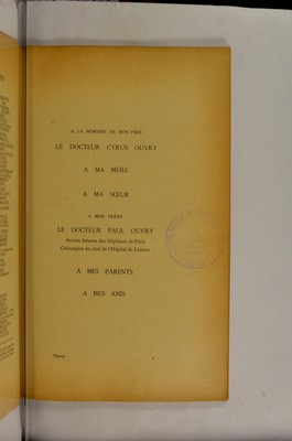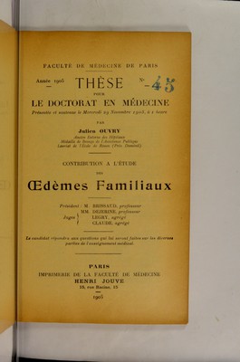 Contribution à l'étude des oedèmes familiaux : thèse pour le doctorat en médecine présentée et soutenue le mercredi 29 novembre 1905, à 1 heure / par Julien Ouvry ; président M. Brissaud, juges MM. Dejerine, Legry, Claude.