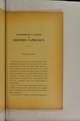 Contribution à l'étude des oedèmes familiaux : thèse pour le doctorat en médecine présentée et soutenue le mercredi 29 novembre 1905, à 1 heure / par Julien Ouvry ; président M. Brissaud, juges MM. Dejerine, Legry, Claude.