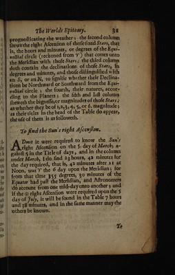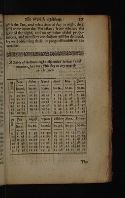 ![fu with the Sux, and what time of day or night they will corse upon the Meridian; from whence the of hour ofthe night, and many other ufeful propo- wie} fitions, and neceffary conclufions will be deduced, im, | by well obferving thefe in prognofticatich ‘ef the tu, weather. ith | BRDASAASEAS BAS REO SAO SAS AAO th: : ie | | A Table of theSuns right Afcention in hours and Aue | ~ minutes, for every fifth day in ary 1 the } in the yeer. oni tk | : | hi OW aT ‘lL! pk y Zane | F ebru.- March , April | May. |: June: | =, ea the 2.) hoami.;| hosmi. | hosmic | ho.m..{ ho.m, } hous ‘ate — — ——. ma te, $ | 19.50.) 21:97°} 23 42 34-43 28/5534 hi. 10| 20-41} 2246} 00 00 $3 113) 48-4) S <5 ra 1§| 20-32.| 2235 | 00 18 nay | 4 8 dOinn igs | 25| 2143 | 2342, 00 54 49-\4 49 6-57 I 1 2 2o| 20°53 | 22542) 0036 | 2 BO.14 28.) 6/37) 2 3 fon 20! 21°33 Yct Bi Ie 95 5 1° qf 18 ite) jae es , Reo rremenresey( iSO TE re by Fuly . Aneufe Septem | Gfober| Nove. Pecems (RAN | =. ee. . ao of Te —— ed | - <j ii a ho.mi. {:ho.mi.:| ho.mi.| -ho.mi-|,ho.mt. Hio.m. § eee eee 2 my = it | 16 1 ¢ 38 q 903m Fak 321 $3 20) MS. 23187) Ba ther 10} 7 $8 4-9 SB daAE $013 404 45 43 [17 4 tion | 8 £8.) 10 a6 | 12 84}. 13 $9 |-16. 5118 16 . 9018 38<| Io 34 } 32 26 14 28 16 2618 .39 cl a5|8 sn] lo1§3 |\12 441) 14 38 |..16 481.19 QO; IQ 23](https://iiif.wellcomecollection.org/image/b30324452_0049.jp2/full/800%2C/0/default.jpg)