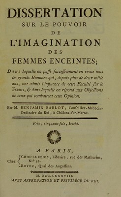 Dissertation sur le pouvoir de l'imagination des femmes enceintes. Dans laquelle on passe successivement en revue tous les grands hommes qui ... ont admis l'influence de cette faculté sur le foetus, & dans laquelle on répond aux objections de ceux qui combattent cette opinion ... / [Benjamin Bablot].