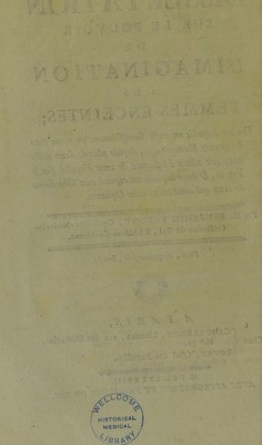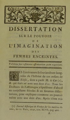 Credit: Dissertation sur le pouvoir de l'imagination des femmes enceintes. Dans laquelle on passe successivement en revue tous les grands hommes qui ... ont admis l'influence de cette faculté sur le foetus, & dans laquelle on répond aux objections de ceux qui combattent cette opinion ... / [Benjamin Bablot]. Source: Wellcome Collection.