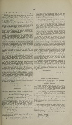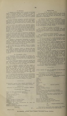![I.—Syphilis. 1. Syphilis is a disease which is curable in the early stages; if hospital treatment is undergone, it may be cured in a shorter time than is otherwise possible. As a rule it requires a long course of treatment, lasting perhaps for several years, even when there is no external sign of the disease. 2. It is extremely contagious, especially by the sores and erosions (however small they may be) which gener¬ ally occur on the genital organs and in the mouth. These contagious sores and erosions may occur, however, on any part of the body. 3. A patient with syphilis must, therefore, abstain from any sexual intercourse when he has the slightest soreness or other lesions on the genital organs unless he lias been certified by a doctor to be free from infection. He must abstain from kissing when he has sores or soft patches on the lips or tongue, for a kiss, even on the healthy skin, may be contagious. 4. Contagion may also be transmitted through the medium of any object which has been in contact with the contagious secretions of the disease; for example, pipes, cigars, cigarettes, towels, clothing, spoons, glasses, &c. Great care must be taken to avoid infecting others in this way. 5. Syphilis is hereditarily transmitted to children (who generally die), wrhen it has not been sufficiently treated. A syphilitic sufferer should not marry without consulting a doctor and obtaining his permission after a full and truthful statement of his illness. 6. A child born of a syphilitic father or mother should never be wet-nursed, as it may transmit syphilis to the nurse. 7. When a syphilitic subject is affected with any other illness, he should always inform his doctor of his former syphilis, for this information may be very useful in the direction of treatment and for the cure of the complaint. II.-—Gonorrhoea (Clap). 1. Gonorrhoea (Clap) in a man is a serious com¬ plaint, and should never be neglected. If not treated, it is liable to lead to stricture and other dangerous and troublesome results. 2. In a woman this disease is still more serious, and often results in sterility, chronic ill-health, or even loss of life. The infant of a mother suffering from gonorrhoea is uot infrequently blinded by the disease. 3. It is extremely contagious and may remain so even after all apparent discharge and soreness have dis¬ appeared. A “ gleet ” is often very contagious. If any of the discharge gets into the eye, violent inflammation will be caused and the sight may be destroyed. This may occur from towels, sponges, clothing, &c. Both children and adults have frquently lost their sight from contagion conveyed in this manner. 4. A patient with gonorrhoea must therefore abstain from sexual intercourse and from marriage until he has been examined by a doctor and has been informed that he is free of infection. The slightest trace of discharge or soreness may be virulently contagious to others. [Information required from medical practitioners sub¬ mitting sample of blood for Wassermann reaction.] Queensland. Laboratory of Microbiology and Pathology, Brisbane. Wassermann Reaction. Serial No. Name (or other identificatory symbol) : Age: Sex: Occupation: History of present illness: Lesions now present: Past illness: Family history: Diagnosis: Nature and Date of Primary Stage: Nature and Date of Secondaries: Nature and Date of Tertiaries: Treatment. If ‘: 606,” neo-salvarsan, &c., used, give Dates of Injections: Results of Treatment: Result of previous Wassermanns (if any) : Signature. Please Note. 1. Use of form essential. It is imperative for scientific reasons that the details required by this form should be properly filled in for every case. Unless this is done, the Laboratory cannot undertake the examination. 2. Charges and reductions in certified cases. The ordinary charge for the Wassermann reaction in private cases is £2 2s. Where, however, a medical practitioner certifies in writing that the patient is unable to pay the full charge, a reduction to any specified sum, or free examination, may be granted at the discretion of the Commissioner of Public Health. 3. Dates for sending in specimens. The test will be performed each Friday only, and specimens must be lodged at the Laboratory, at College road, Brisbane, between 12 noon on Thursday and 10 a.m. on Friday. 4. Method of taking specimens. The undermentioned method should be closely fol¬ lowed when taking specimens for the Wassermann reaction:— (1) Use a syringe with a readily detachable needle. (2) Sterilise syringe by boiling for half an hour in 2 per cent, sodium citrate solution. (3) Unless the 5 c.c. phial is obtained from the Laboratory, sterilise it by boiling for half an hour. (4) Prepare patient’s arm over median basilic vein by washing well: (1) with hot water and soap; (2) with 5 per cent, carbolic solution, or similar non¬ mercurial disinfectant; (3) wdth absolute alcohol, or rectified spirit, allowing it to dry off; (4) with sulphuric ether, allowing it to dry off. (5) Having, by digital pressure, or a tourniquet above the vein, caused it to fill, plunge the needle in centripetally, withdraw plunger, and fill syringe. If syringe capacity is 5 c.c. or over, withdraw needle from vein and empty into bottle. If less than 5 c.c., detach syringe from needle, empty contents into bottle, refix to needle, and repeat till bottle is full. In cases where it is not considered advisable to withdraw the full 5 c.c. of blood, the amount may be reduced to not less than 1V2 c.c. The test cannot be satisfactorily made with less than this latter amount. (6) Securely cork or otherwise seal the bottle. (7) Pack and address to Director, Laboratory of Microbiology, College road, Brisbane. [Notes required for issue of salvarsan or neo-salvarsan to hospitals.] Department of Public Health, Queensland. Notes and history of case treated with issued by the Department of Public Health, Queens¬ land, to' ' Hospital at Drug: Amount: Issue by: Date: Chec