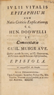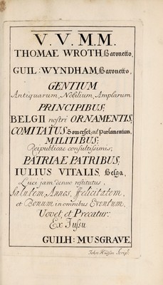 Antiquitates Britanno-Belgicae, praecipue Romanae ... tribus voll. comprehensae ; quorum I. De Belgio Britannico. II. De Geta Britannico. [Acc. ... de icuncula quondam M[agni] Regis Aelfredi dissertatio] III. De Julii Vitalis epitaphio [cum notis ... Hen. Dodwelli ... Quibus acc. ... ad cl. Goetzium, de Puteolana et Baiana inscriptionibus, epistola] : quibus acc. appendix / [William Musgrave].