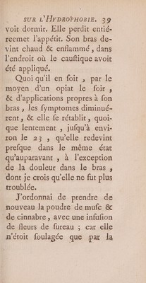 Credit: Essai sur l'hydrophobie, : précédé de l'histoire d'une personne mordue par un chien enragé, ... / Traduit de l'anglois de Christophe Nugent, ... Auquel on a joint Une dissertation sur la chaux-vive & sur l'eau de chaux. / Par Charles Alston. Source: Wellcome Collection.