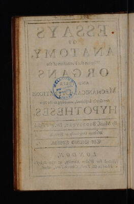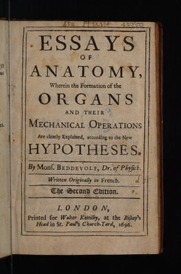 Essays of anatomy, wherein the formation of the organs and their mechanical operations are clearly explained, according to the new hypotheses ... / [Dominique Beddevole].