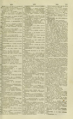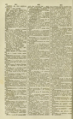 ![SEBIFERE, adj. (did.) sebiftrous ; oil-beanng. Glande —, (orn.) oïl-liag. SEBILE , n. f. sebtlla ; wooden bowl. SEC, SÈCHE, adj. i. | 5 dry; 2. U thin; lean ; spare ; 3. S jejunc;bar- ren ; unornamented ; plam : 4. § un- feeling; insensible; cold; hard ; 5. S unaffable; 6. (of answers) dry; sharp; tari; 7. (of blows) quiclc; 8. (of the eycs) unmoist; dry; 9 (of fruits) dried (by art); dry ; 10. (of looks) dissalis- ficd; 11. (of llie mass) without the consécration; 12. lof money) ready ; ) down; 13. (of pottery) dry'body ; 14. (of reprimands) severe; sharp; 15. (of wiue) dry; unlilce liqueur, cordial: 16. (of Lite puise) sharp; 17. (paint., sculp.) hard. SEC, n. m. 1. dryness ; 2. manger food; 3. (sing.) sweetmeats, pl. Tout — t, ( V. senses) merely ; only. À—, 1.1|dry (without watcr); 2.'||drain- ed; 3. S drained; exhausled; 4 S ouf of cash; hard up; 5. (nav.) high and dry (on tbc shore); G. (nav.) ahull; under bare pôles. Faire —, (of the weatlier) to be dry; mettre à —, 1. | fo drain; 2. § fo drain: to exhaust. SEC, adv. 1. J (of drinking) net (with- out waier); 2 S dryly: sharply; tartly. SÉCABLE, adj. (did.) scissile. SÉCANT, E, ad), (geom.) sécant. SÉCANTE, n. f. (geom.) sécant. SÉCATEUR, n. m. (sing.) (agr., bort.) pruning-shears, pl. SÉCHAGE, n ni. drying. SECHE, SEICHE, n. f. (mol.) cuttle- fsh. Os de —, (conch.) cuttle ; cuttle- bone. SÈCHEMENT [sèchman] adv. 1.1| dryly; 2. S dryly ; sharply: tartly; 3. §jeju- nely; barrenly; plainly; without orna- ment. SECHER, v. a. 1. || S fo dry: 2. || fo dry up; 3. jj fo cure (in order to pre- servo hay ). Séché, e, pa. p. V. senses of Séciier. Non —, un dried. — au soleil, sun- dried. Se sécher, pr v. 1.1 fo dry 0.'s self; 2. (lli.) fo dry: 3. (th.) fo dry up. SÉCHER, v. n. 1.1| fo dry; 2. || fo dry up ; 3. S (DE, xoith) to fine; to pine aiuay. 3 — do langueur, de tri&tossc, to pino, to pine away with langoui, nielancholy. — sur pied, S 1. fo pine aivay ; 2. fo be exlremely dejected; 3. (jest.) fo pine away in single blessedness (remain un- married). SECHERESSE [aèchràs] n. f. 1. || § dryness ; 2. | drought ; droughtiness ; 3. S dryness; sharpness ; tartness; 4. S jejuneness ; barrenness ; plainness ; want of ofnament; 5. S (dévotion) dry- ness. SÉCHER1E [sèchri] n. f. (a. Sc m.) dry- house. SÉCHOIR, n. m. 1. (a. 8c m.) drying- room; 2. ( rur. econ.) sweating-room ; 3. (spin.) tenter ; 4. (tech.) dryer. SECOND [scgoii] E, adj. 1. || § second; 2. S second; olher. Eau —e, (chem. ) lye-water. Au — étage, on the second floor, story. Jouer le — rôle auprès de q. u., fo aci second to a. 0. SECOND [seyon] n. m. 1. 1 second; 2. || second story, /loor; 3. S assistant ; 4. t second (in duels); 5. (nav.) mate. Au —, on the second floor, story ; en —, 1. in the second order; 2. (mil., nav.) second; sans — t, unequalled; matchless; peerless. SECONDAIRE [srgondi'rr] adj. 1. secon- dary; accessory; 2. (did.) secondary ; 3. (med.) secondary; 4. (med.) conse- cutive. Affaires —b, (pl.) (K. senses) under- work, Bing; caractère, état — , eecon- dariness ; accessoriness ; personnage —, underpart; rôle —, under part. SECONDAIREMENT [»egondèrman] adv. secondanly: accessonly. SECONDÉ («egondd] n. f. 1. (of lime) second; 2. (feue.) segoon; 3. (school.) second class-, second: 4. (mus.) second. — augmentée, (mus.) sesauitone ; — s fixes, (horol.) dead seconds, pl. En —, in the second class. SECONDEMENT [sugondman] adv. se- condly; ( m the second place. SECONDER [segondc] v. a. 1. tosecond (a. 0.); fo assis t; to help: to aid; ( fo bâcle; 2. $ to second (a. th.); fo pro- mote; to further; to encourage ; 3. S (0 countenance; to favour. Secondé, e, pa. p. V. senses of Se- conder. Non —, sans être—, 1. unseconded; unassisted: unhelped; unaided: unsus- tained; unbacked; 2. S unseconded: un- promoted ; unfurlhered : unencoura- ged : 3. $ uncountenanced ; un favour- ed. SECONDINE.n. f. 1. (bot.) secundine: 2.—s, (pl.) (physiol.) secundines, pl.; after-birth, sing. SECOUEMENT [sekouman] n. m. \ sha- king: shake. SECOUER, v. a. 1. || to shake v/; ( fo pire 1/ (a. 0.. a. th. ) a shake, shaking ; 2. |i $ fo shake y/ off: to throw 1/ off; 3 || ta jog: 4. || fo fois; 5. S fo shake j off ( rid o.’s self of); fo discard; G. § fo tonnent; to shake y/. 1. — un arbre . la tête, to sliake a tree, o.’s hr.ad. 2. Un bœuf qui secoue son joug , an ox that shakes off his yoke. 3. —la table, to jog the table. 4. Être secoué par la tempête , to be tossed by the tempest. 5. — ses préjuges , to shake off, to discard o.’s préjudices. 6. Cette maladio l'a bien secoué . Vus discase has tor- mented, shaken him much. — (en se défaisant de), to shake off; to cast y/ off; to throw \/ off; — 'en déployant), fo shake \J ouf ; — (en déta- chant), fo shake \J off; — (légèrement), to jog; — (en rejetant), fo shake \J off; — (en faisantsoriir), fo shake >/ oui: — (en soufflant), fo btow J off;— (en fai- sant tomber), fo shake jdown. Sf.coué, e, pa. p. F. senses of Se- couer. Non —, sans être —, ( V. senses of Secouer) | § unshaken. Se secouer, pr. v. 1. || fo shake F 0. ’s self; 2. y fo take \f exercise; ( fo move about : 3 S not to remain inac- tive; to be domg;to lookabout one. SECOÛMENT, n. m. ^shalcmg; shake. SECOURABLE, adj. 1. help fui : 2. ( À,...) willing, ready to assist. to help, tosuccour...; 3. (mil.) redevable. SECOURIR, v. a. irreg. (conj. like Courir) fo relieve : to succour ; to be a succourer of ; to help; toaid; to as- sist Qui ne secourt pas, (V. spnses) un- helpful ; qu’on ne peut —, (K. senses) unreiievable. Secouru, e, pa. p. V. senses of Se- courir. Non —, unreheved; unsuccoured ; unhelped: unaided; unassisted. SECOURS, n. m. 1. relief; succour ; help; aid ; assistance 2. relief (cha- rity); 3 rescue; 4. $ chapel of ease; 5. (nul ) relief; aid. Faible —, sliglit relief, succour, help, aid, assistance. — de la com- mune, pa
