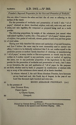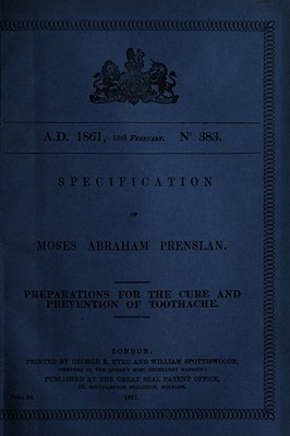 Specification of Moses Abraham Prenslan : preparations for the cure and prevention of toothache.