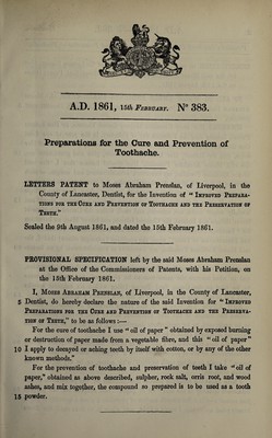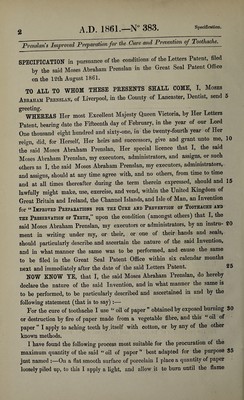 Credit: Specification of Moses Abraham Prenslan : preparations for the cure and prevention of toothache. Source: Wellcome Collection.