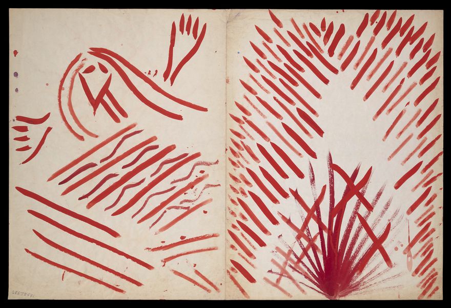 Credit: Red diagonal and curved lines and droplets, and a rounded shape with hands. Source: Wellcome Collection.