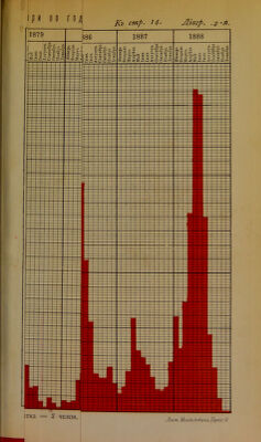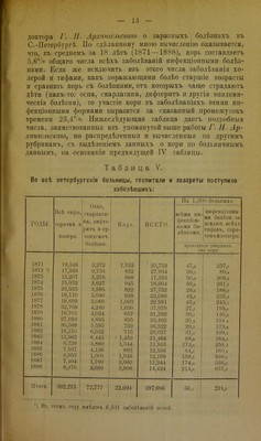 ![доктора Г. И. Архангельстю о заразвыхъ болѣзеяхъ въ С.-Петербургѣ, По сдѣланному мною вычисленііо оказывается, что, въ средеемъ за 18 лѣтъ (1871 —1888), корь сосгавляетъ 0,6°Іо общаго числа всѣхъ заболѣваній инфекціонными болѣз- нями. Еслп же исключить изъ этого числа заболѣвавія хо- лерой и тифами, какъ поражающими болѣе старшіе возрасты и сравнить корь съ болѣзнями, отъ которыхъ чаще страдаютъ дѣти (какъ-то: оспа, скарлатина, дифтеритъ и другія эпидеми- ческія болѣзни), то участіе кори въ заболѣваніяхъ этими ин- фекціонными формами выразится за сказанный промежутокъ времени 23,4^/0. Нижеслѣдующая таблица даегъ подробныя числа, заимствованныя изъ упомянутой выше работы Г- И. Ар- хательскаго, но распредѣленныя и вычисленныя по другимъ рубрикамъ, съ выдѣлевіемъ данныхъ о кори по больяичвымъ даннымъ, на основавіи предъидущей ІУ таблицы. Таблица V. Во всѣ петербургскія больницы, госпитали и лазареты поступило заболѣвшихъ: годы. 187] 1872 1873 1874 1875 187« 1877 1878 1879 1880 1881 1882 1883 1884 1885 1886 1887 1888 Итого. Всѣ тифы, горячки и холера. Оспа, скарлати- на, дифте- ритъ и пр. ЭІ1ИД0МИЧ. болѣзни. Корь. 19,348 17,348 13,207 15,032 23,335 18,110 18,899 32,709 16,701 27,924 30,568 16,310 13,562 6.729 7.597 8,953 7,404 8,479 3,272 9,734 3,278 2,627 3,595 3,040 3,089 4,240 4,024 4,683 5,595 6,032 6,443 3,860 4,136 1,300 1,780 2,039 ВСЕГО. На 1,0(К) больныхъ всѣми ин- инфекціонны фекціон- Г лѣзнлмп. Г'''^''' |Чекъ и холеры приходится умершихъ 1.132 23,752 47,6 257,0 852 27.934 30,.^ 80,4 868 17,353 50,0 209,8 945 18,604 50,8 261,7 822 27,752 29,6 186,0 938 22,088 42,. 235,8 1,003 22,991 43,6 245,1 1,030 37,979 21,382 27,. 195,4 657 30,7 140,3 855 33,462 25,5 154 3 759 36,922 20.5 119,4 715 23,057 31,0 109,.: 1,459 1,344 21,464 68,0 184,ѳ 11,933 112,8 258.2 803 12,536 64,0 160,.5 1,946 12,199 159,5 599.5 2,060 11,244 174,3 586,4 3,906 14,424 214,п 657,0 302,215 I 72,777 22,094 397,08(; 23'г,о ') Въ этомъ году имѣлогь 6,591 заболіванін оспой.](https://iiif.wellcomecollection.org/image/b22308520_0021.jp2/full/800%2C/0/default.jpg)