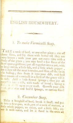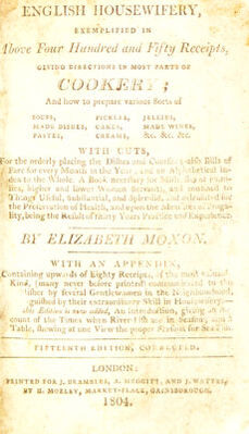 English housewifery : exemplified in above four hundred and fifty receipts, giving directions in most parts of cookery ... / by Elizabeth Moxon. With an appendix containing upwards of eighty receipts ... communicated to the publisher by several gentle women in the neighbourhood .... To this edition is now added an introduction giving an account of the times when river fish are in season; and a table shewing at one view the proper seasons for sea fish.