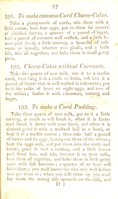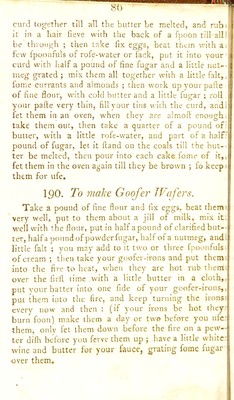 ![] 80. To mal e a Tansey another way. Take a pint of cream, fotne biieiiits without feeds, two or three fpoonfuls of fine flour, nine r“ggs, leav- ing out two of the whites, fome nutmeg, and orange flower-water, a little juice of tanfey and fpinage, put it into a pan till it be pretty thick, then fry 01 bake it, if fried take care that you do not let it be over brown. Garnifh with orange and fugar, fo ferve it up. 181. A good Paste jar Tarts. Take a pint of flour, and rub a quarter of a pound of butter in it, beat two eggs with a fpoonful of double-refined fugar, and two or three fpoonfuls of cream to make it into pafte ; work it as little as you can, roll it out thin ; butter your tins, dull on fome flour, then lay in your palle, and do not fill them too full. 182. To make transparent Tarts. Take a pound of flour well dried, beat one egg till t be veiy thin, then melt almolt three quarters of a tound of butter without fait, and let it be cold enough o nrx with an egg, then put it into the flour and nake your palle, roll it very thin, when you are'fet- ing them in the oven wet them over with a little fair rater, and grate a little fugar ; if you bake them ightly they will be very fine. 183. To make a Shell Paste. Take half a pound of fine flour, and a quarter of a ound of butter, the yolks of two eggs and one diitc, two ounces of fugar finely fitted, mix all lefe together with a little water, and roll it very fin vvhillt you can fee through it ; when you lid](https://iiif.wellcomecollection.org/image/b2152452x_0085.jp2/full/800%2C/0/default.jpg)