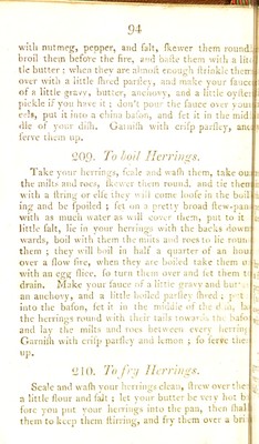 Credit: English housewifery : exemplified in above four hundred and fifty receipts, giving directions in most parts of cookery ... / by Elizabeth Moxon. With an appendix containing upwards of eighty receipts ... communicated to the publisher by several gentle women in the neighbourhood .... To this edition is now added an introduction giving an account of the times when river fish are in season; and a table shewing at one view the proper seasons for sea fish. Source: Wellcome Collection.