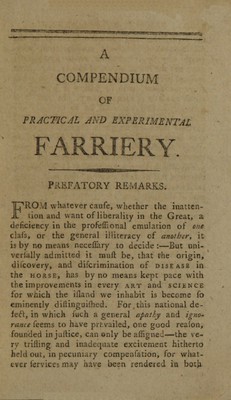 A compendium of practical and experimental farriery : originally suggested by reason and confirmed by practice, equally adapted for the convenience of the gentleman, the farmer, the groom, and the smith, interspersed with such remarks, and elucidated with such cases, as evidently tend to insurethe prevention, as well as to ascertain the cure of disease / by William Taplin, surgeon.