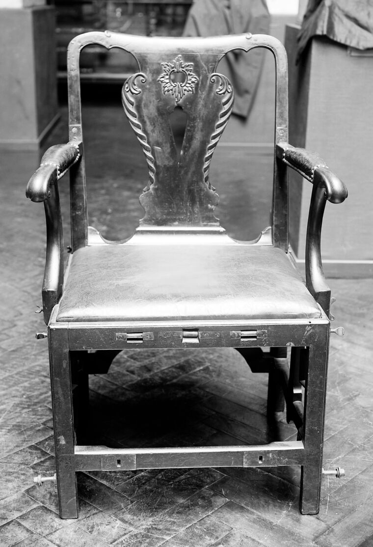 M0007461: Front view of barber surgeon's chair, c. 1715. In copyright. Source: Wellcome Collection.
