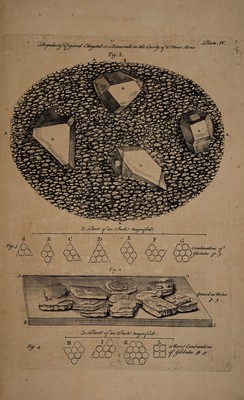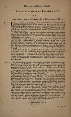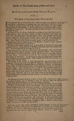 ![An Explanation of the Third Plate. F t 0. x. The Sparks of Fire ftruck from a Flint and Steel. IN the common Way of ftriking Fire with a Flint and Steel, fiery Sparks fly out at Globules of every Blow ; which Sparks are nothing more than fmall Pieces of the Flint or Steel, Stec]* (but ufually of the Steel) broken off by the Violence of the Stroke, and either melted inftantaneoufly into Steel Globules, or made at leaft red-hot, and thereby capable of kind¬ ling Tinder or Touch-wood. The Heat is likewife fo intenfe fometimes as even to vitrify the broken Particles. As a Proof of this, Dr. Hooke ftruck Fire over a Sheet of very white Paper, and ob~ ferving diligently where the Sparks feemed to vanifh, he difcovered there certain very fmall, black, but glittering and moveable Specks, which, when examined with his Mi- crofcope, appeared to be little round Globules; fome whereof did, from their Surface, yield a very bright and ftrong Refle&ion on that Side next the Light, and refembled Iron- Balls. One of which, whofe Surface was pretty regular, is (hewn by the Letter A. He perceived in this the reflected Image of the Window, and alfo of a Stick, which he moved up and down between the Light and it. He found others almoft regularly round, as to the Bulk of the Ball, but with rough unpolifhed Surfaces; which rendered the Refledion from them much more confufed and faint. Such are reprefented by the Letters B, C, D, E. Some were cracked or cleft, as C; others broken and quite hollow, as D; which feemed like half the hollow Shell of a Granado, broken irregularly in Pieces. There were other different Shapes; but that in particular, marked with the Letter E, was a larger Spark of Fire than ordinary. It went out on one Side the Flint employed in ftriking it, and ad¬ hered thereto by the Root F. On the Top of its Stem was faftned half an hollow Ball, with the Mouth of it opening upwards; fo that it appeared fomewhat like a Funnel, or a Rummer-Glafs without a Foot. The melting oP the Particles of Steel, inftantaneoufly, upon the Collifion, is very wonderful, and comes up nearly to the Effeds of Lightning : Indeed there feems to be in Iron or Steel a fulphureous combuftible Matter very eafily put in Adion ; for either ham¬ mering, filing, or rubbing it with Violence, will prefently make it fo hot as to be able to burn one’s Finger: And if the Filings of Iron are only let drop through the Flame of a Candle, (placing a Sheet of white Paper underneath, to catch them for Examination) many of them will be found melted even by that fudden Tranfit, and appear remarkably (hining to the naked Eye; and if we view them farther by the Microfcope, we (hall foon be fatisfied they are exadly fuch round Globules as are formed by ftriking Fire with a Flint and Steel. As obtaining fuch minute Globules as thefe, of Lead or Tin, and that, even in Quan- Globules of tity, eafily and quickly, may be'defirable by fome, we (hall here fubjoin the Way ofLead or 're¬ forming them, which Dr. Hooke fays a learned Phyfician taught him. Reduce the Metal you would fhape thus, into exceedingly fine Filings : for the fmaller your Filings are, the fmaller will be your Globules. Strew fome fine and well-dried powder of* Quick-Lime at the Bottom of a Crucible, on which fcatter fome of your Fil¬ ings very thinly j then drew on more Powder, on that again more Filings, and fo alter¬ nately, Stratum fuper Stratum, till you have filled your Crucible, in fuch a manner, that, as near as may be,A no two Filings may touch each other. Place the Crucible in a gra¬ dual Fire and increafe the Heat by Degrees, till it be fufikient to make all the Filings mix’d with the Quick-Lime melt, and no more. For if the Fire be too hot, many of the Filings will join and run together: But if the Heat be duly proportioned, upon walking the Lime-Duft in Water, all thofe fmall Filings of the Metal will fubfide to the Bottom, in a moft curious Powder, confiding of Balls or Globules exadly round; which, if very fine, is excellent for Hour-Glades. One may at any time, procure immediately minute Globules of Lead, by only Globules of kindling a red Wafer, fuch as Letters are fcaled with, at a Candle; for as it burns (and Lead- it will not go out till it be wholly confumed) the red Lead employed in the Colour¬ ing melt% and falls down, in regular minute Globules j which, if a Sheet of dean C wh:te](https://iiif.wellcomecollection.org/image/b30451048_0019.jp2/full/800%2C/0/default.jpg)