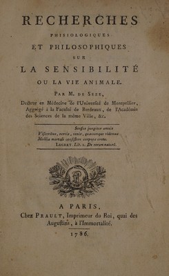 Recherches physiologiques et philosophiques sur la sensibilité, ou la vie animale / Par M. de Seze.