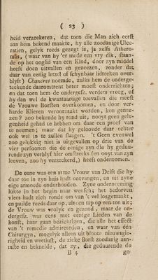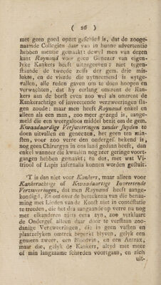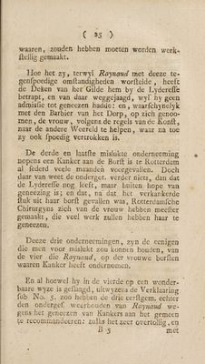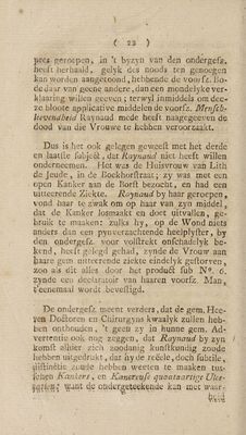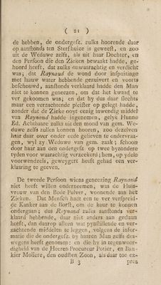 ![*1 i - ■ ! ( 2! ) i I de hebben, de ondergefz, zulks hoorende daar i op aanftorids ten Sterf huize is geweeft, en zoa I uit de Weduwe zelfs, als uit haar Dochter, en I den Perfoon die den Zieken bewaakt hadde, ge- I hoord heeft, dat zulks on waarachtig en verdicht was; dat Raynaud de wond door infpuitinge ï met laauw water hebbende gezuivert en voorts j -befchouwd, aanftonds verklaard hadde den Man I niet te konnen geneezen, om dat het kwaad te I ver gekoomen was; en dat hy dus daar Hechts j maar een verzachtende pleifler op gelegt hadde, zonder dat de Zieke ooyt eenig inwendig middel van Raynaud hadde ingenomen, gelyk Hunne Ed. Achtbaare zulks uit den mond van gem. We» I duwe zelfs zullen konnen hooren, zoo dezelvea I haar daar over onder eede gelieven te ondervraa- I gen, wyl zy Weduwe van gern. zaak'; fchooiï j ^door haar aan den ondergefz op twee byzondere i tyden voor waarachtig verzeekerd ;hem , op ydele voorwendzels, geweygerc heeft gehad een ver- ■ klaaring te geeven. i i De tweede Perfoon wiens geneezing Raynaud niet heeft willen onderneemen, was de Huis- : vrouw van den Bode Pulver, woonende aan heS I Zieken, Dat Menfch hadt een te ver verfpreid- I de Kanker aan de Bord, om de kuur te koonen ] ondergaan; duè Raynaud zulks aanftonds ver^ i klaard hebbende, daar niet anders aan gedaan j heeft, dan daarop alleen v/at pynhillende en ver- zachtende middelen te leggen, volgens de infor» : matie die de ondergefz, by haaren Man zelfs des^ j wegens heeft genomen: en die hy in tegenwoor- j digheid van de Heeren Procureur Potier, en Ban-- j kier Moliere, den oudften Zoon, als daar toe ex- I B 3 pres 5](https://iiif.wellcomecollection.org/image/b30511471_0025.jp2/full/800%2C/0/default.jpg)