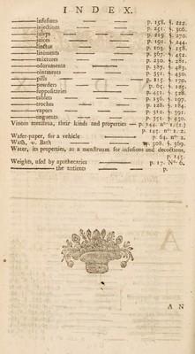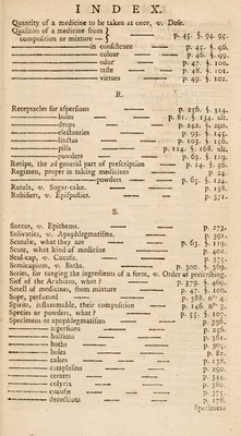 Credit: A complete extemporaneous dispensatory; or, the method of prescribing, compounding, and exhibiting extemporaneous medicines. In which is contained at large, the doctrine of all those various forms, both external and internal, which are now in use. Exemplified with many accurate specimens of each / Translated from the Latin original of the learned H.D. Gaubius ... [by S.M]. Source: Wellcome Collection.