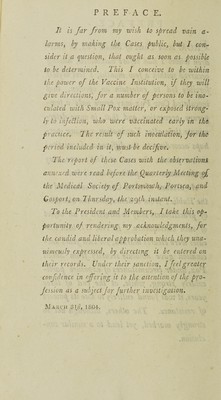 Cases of small pox, subsequent to vaccination, with facts and observations, read before the Medical Society, at Portsmouth, March 29th 1804; addressed to the directors of the Vaccine Institution / [William Goldson].
