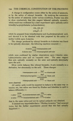 ![and Groh have performed experiments with y0-amino acids and y8-oxy acids and have observed :— HNO2 d-/3-amino-)8-phenylpropionic acid > l-jS-oxy-jS-phenylpropionic acid HNO2 d-j8-amino-j8-phenylpropionic acid ester > l-)8-oxy-i8-phenylpropionic acid ester. HNO2 d-j8-aminobutyric acid ^ l-)3-oxybutyric acid HNO2 d-)8-aminobutyric acid ester > l-/8-oxybutyric acid ester PCI5 AgaO 1-0-oxybutyric acid > d-)8-chlorbutyric acid > l-/8-oxybutyric acid PCI5 ^ ^ ^ AgaO ]-/8-oxybutyric acid ester > d-)8-chlorbutyricacid ester > l-)8-oxybutyric acid and ( hydrolysis NOCl d-/3-aminobutyric acid > l-/8-chlorbutyric acid > d-)8-oxybutyric acid No change occurs with nitrous acid nor with phosphorus penta- chloride, as the same product is obtained both with the ester and the free acid; d-y9-aminobutyric acid has therefore the same configuration as l-/3-oxybutyric acid. Since d-^S-oxybutyric acid is formed from d-^- aminobutyric acid a Walden inversion has been produced by the action of nitrosylchloride. The result is the same as with the a-amino acids. Reviewing the data in 1911 Fischer stated that he thought that the “Walden inversion” was not of the nature of a rearrangement of the groups attached to the carbon atom, but that it was simply the general and normal process of substitution which could be observed on account of the asymmetry of the carbon atom in these cases. Adopting Werner’s view that it was not necessary for the new group to take up the same position as the old group but that it may take up a different position, and regarding the process of substitution as if it were preceded by the formation of complex molecules, as Kekule sug- gested, then during the reaction of the complex molecule the new group may take up a different position to that held by the old group. If in the reaction the shifting take place in every molecule or does not take place at all, then the new compound will have only one configuration; if, however, there be only a partial shifting, then a mixture will result. In the case of optically active compounds we shall have either the one isomer, or the other, or a mixture which represents the racemic form. As racemisation always occurs in the “ Walden inversion ” this hypo- thesis gives a good explanation of the observed phenomena. The reaction is very easy to follow with a model such as Fischer used to represent his views, but they may also be represented on a plane surface.](https://iiif.wellcomecollection.org/image/b28123219_0001_0162.jp2/full/800%2C/0/default.jpg)