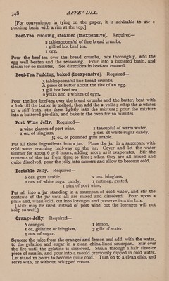 ![; Drinks, Coffee (inexpensive). Required— 1 tablespoonful of coffee. ¥% cupful hot milk, 1 cupful of boiling water. The good quality of the coffee will very much depend upon the way in which it is made, and upon the fresh and thorough roasting of the berry. Good coffee should always leave a coloured stickiness round the cup, and should never be boiled, but made with boiling water, and served very hot. A simple and plain method to make coffee is ina jug. Heat the jug and dry it, put in the coffee and pour the boiling water over it, Cover tightly and allow to stand on the hob, or by the side of the fire, for 5 minutes, Pour a little coffee into a cup and back into the jug. Repeat ee cover again, and leave for 10 minutes to become clear, Serve with ot m [Note.—In cooking milk, watch it constantly, and remove from fire just before it boils.] Tea (inexpensive).—Have a kettle of fresh water, and infuse the tea directly it boils, The long boiling of the water causes the tea to have a flat insipid taste. Make the teapot very hot, and dry it thoroughly. Allow 1 teaspoonful of tea for each person, and 1 teaspoonful over (this is allowing 2 cups of tea for each), Pour on the boiling water, let the tea stand covered from 3 to 5 minutes, never longer. Pour off the tea into a fresh hot teapot or jug. On no account allew the tea to remain longer on the leaves, or it will become bitter, A Cup of Chocolate. Required— 2 ozs, of chocolate, ¥% pint milk. I egg. Sugar to taste, Put the chocolate into a saucepan with the milk, and, when hot, work with a spoon into a smooth paste free from lumps, Stir over the fire and boil for 5 minutes, Beat the yolk and white of the egg to a stiff froth, and strain into a jug, strain on to this the chocolate, and beat with a whisk for 5 minutes, or until the chocolate is quite frothy, [A small teacupful is sufficient to give at a time with a little sponge- cake or finger biscuit.] Cocoa (inexpensive), Required— 2 ozs. of cocoa nibs or flakes. 3 pints cold water. Put the cocoa into a very clean saucepan with the water, and simmer, with the lid on, by the side of the fire for 5 or 6 hours, Strain. Add ¥% cup of milk to % cup of cocoa. [Cocoa nibs are cheaper and purer than many of the prepared powders. ] Barley Water (inexpensive). - Required— 2 ozs, of pearl barley. % lemon, 1 oz, of loaf sugar, I quart of water, Wash the barley, put it into a clean saucepan, with 1 pint of cold water, allow to boil for 5 minutes, throw away the water and wash the barley again, Return the barley to the saucepan with a quart of cold water, the sugar, and thin yellow rind of the lemon. Simmer for about](https://iiif.wellcomecollection.org/image/b3273332x_0372.jp2/full/800%2C/0/default.jpg)