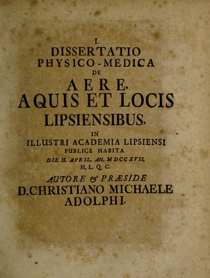 Trias dissertationum physico-medicarum chorographiam medicam potissimum spectantium, quarum I. De aëre, aquis et locis Lipsiensibus. II. De salubritate Silesiae. III. De incolatus montani salubritate. Inscribuntur, quaeque in illustri Academia Lipsiensi publice quondam habitae sunt.