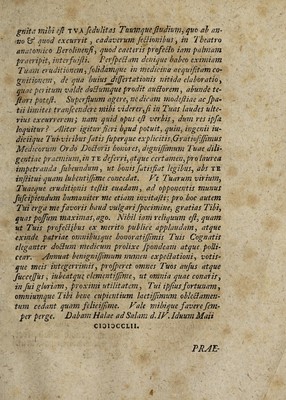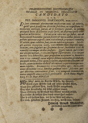 ![PRAENOBILISSIMO D0CTTSSIMOOVE SVMMAE IN MEDICINA DIGNITATIS CANDIDATO S. P. D. PET. IMMANVEL HARTMANN, MED. DOCT, Jfia fere communii plurimorum medicorum nunc e fi iniuria, ^ quid? quod praefifcine dixerim, fi oli ditas, ut exquifitam re¬ mediorum notitiam parum ad fe pertinere putent, ut potius, quidquid huius e fi fidentiae atque artis, ad pharmacopoeos rele¬ gandum arbitrentur. Veruyn enim vero aut ego fallor, aut ab iulus c emo di hominibus parum Jolatii & minus adhuc falutis ex* peccare poterunt aegroti; cum ridiculumfit, propinare remedia9 & eorum, quae exhibita fiunt, veram indolem ignorare. Intelli- gis, amice perqvam CARE, tici minime hanc imprimi igno¬ miniam , cum fingulari nes fipeciminc doceas, luculenter tibi de remediis eorumque viribus conflare* Quare tum ii, qui te mi¬ nus alio qui noj'eunt, e t v a intelligent differt at ion e, tibi utique merito tvo deberi illos, quos prope di em accepturus es, honores: tum tyae commifji curae aegri,refiituta valetudine,probabunt, nusquam melius, fi Dei opem exceperis, aegrotorum fiduciam col¬ locari, quam in medico docto & ad rationis experientiaeque nor¬ mam expolito. Ita omnes res t v\s felicij]ime ages; ita in com¬ mune Jplendidac tyae familiae gaudium vives: jed vives quo¬ que amicitiae convenienter, fi me, tvi nunquam imtnemorem, mutuo ample bli amor e,ut facis, perrexeras. Scrib. Hala e Magae - biirg. FI. Id.Maii MDCCLIL felig! wenn ein Tlrjf fcie 2i?ur&£, frie $r^£)uvd) eigne 2£urt>e nocfj cwf £6f>re <£tufen ffiljrf, sjgenn fcin gcfldrterSBifc, burd) SBffleit ausgebauef, teber jvrcmfenfur felbfl geftd;et* tvanct ggeun 0'i’timmg im SSerficmb ba$ twttflid) wcdfitt fredjer j?ranff)eit 2£ut burd? neues jjveil «mtfeeU; g£cr fo mli f)ei(fam fei)n, mv fo bcr SBelt noill nfi^en, ©ermujj, gelieb W^vcunb, cinSjcrj, witlDtiw, 6ef?$en. £einrici) Slcnolt) 9)?aUinfrot, au$ $oc&um iu iw ©V«f|c&aft](https://iiif.wellcomecollection.org/image/b31970692_0048.jp2/full/800%2C/0/default.jpg)